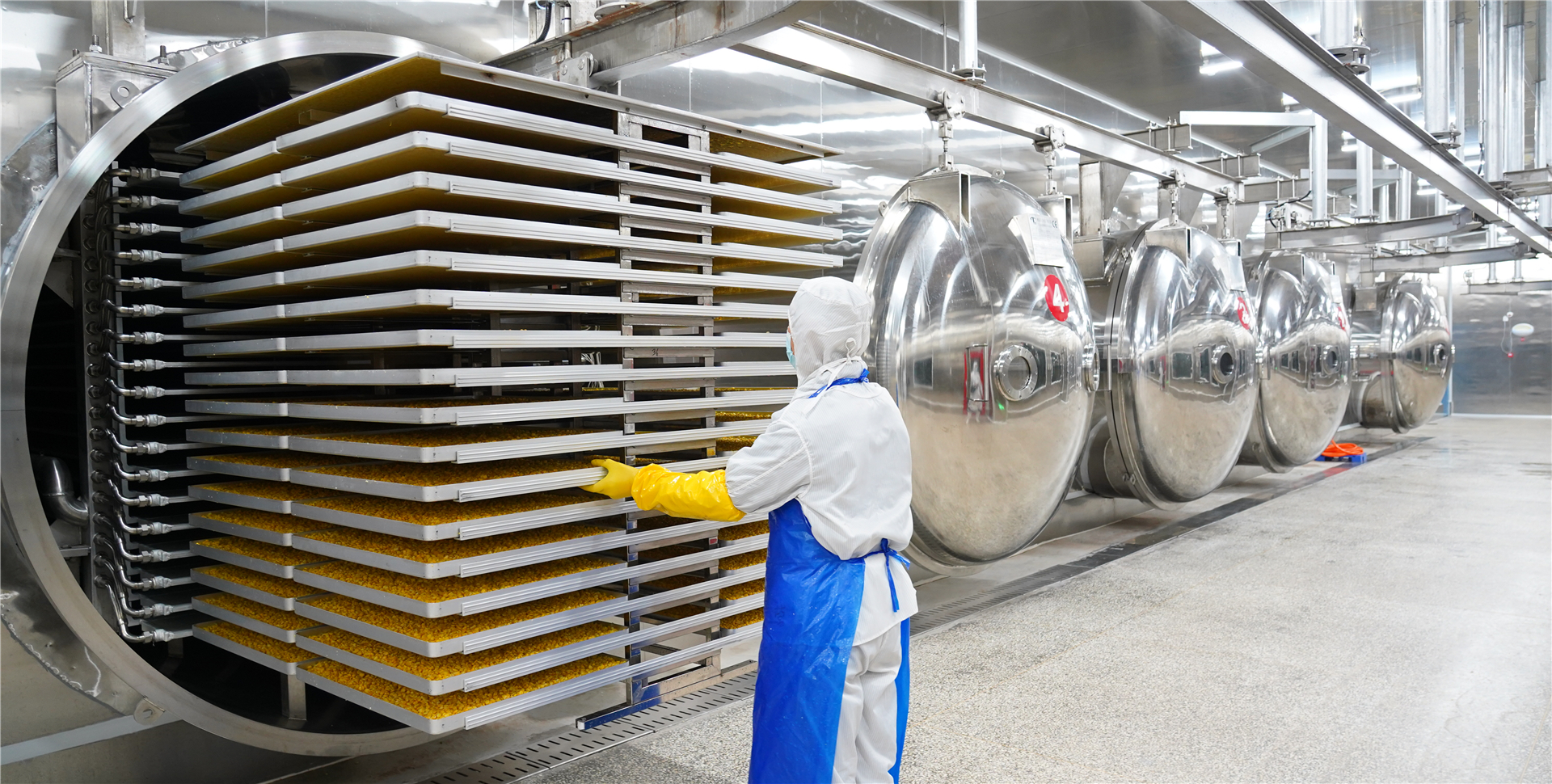 凍干成套設備一般由凍干倉、控制系統(tǒng)、加熱系統(tǒng)、物料運輸系統(tǒng)、制冷系統(tǒng)、冷卻水系統(tǒng)、氣動系統(tǒng)、真空系統(tǒng)組成。公司擁有30年的技術積累,在果蔬凍干領域擁有50%以上的市場占有率,為全球知名的凍干果蔬工廠提供全套的設備及自動化配套,可以提供不同型號的設備,裝料重量從300kgs~2500kgs均可定制。交貨周期和安裝調試周期可按客戶要求制定,售后團隊專業(yè)、反應迅速。